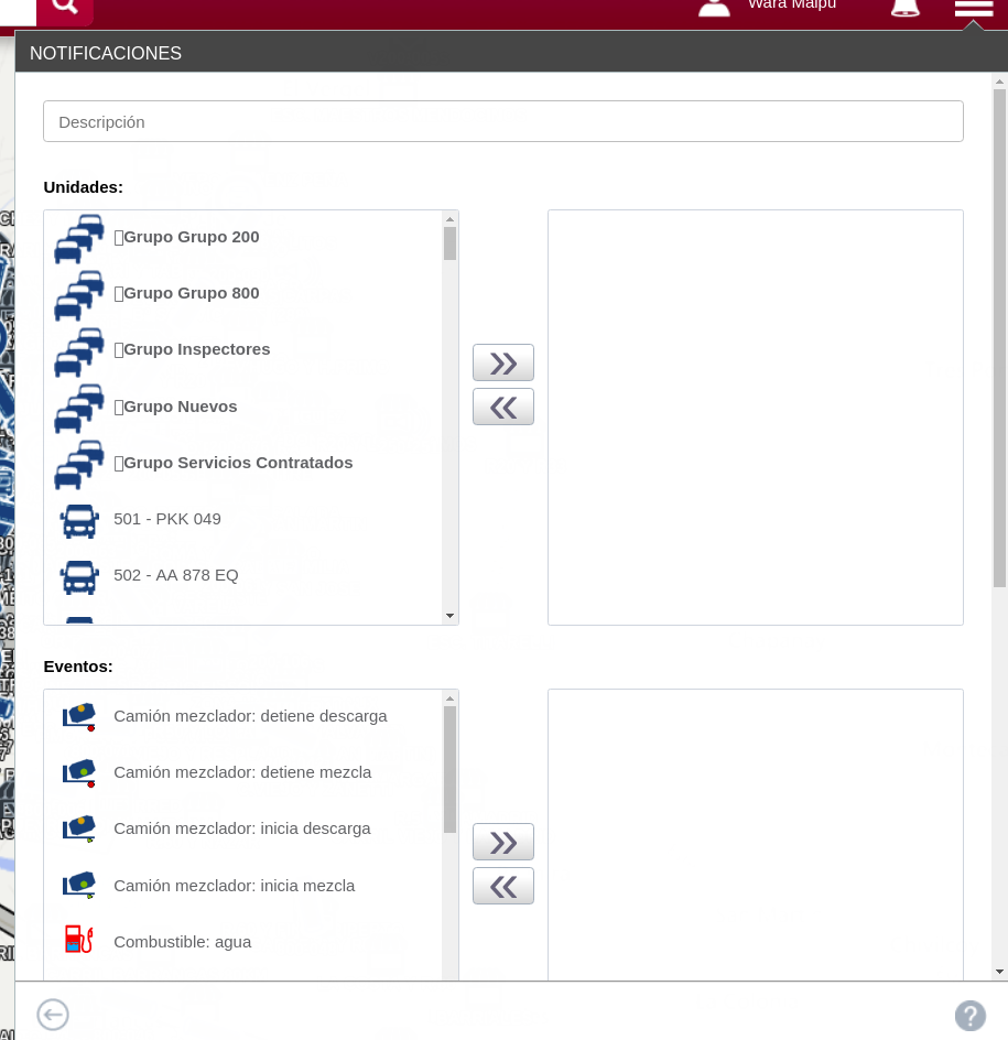 - UNIDADES, aquí seleccionaremos la o las unidades de las que esperamos notificación, esto puede incluir algunas unidades o toda nuestra flota. Seleccionamos las unidades de la columna Izquierda y las pasamos a la columna derecha.