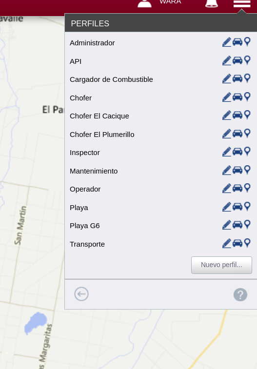 PERFILES, creamos perfiles para darle a distintos usuarios distintos poderes sobre las herramientas de la plataforma, a esto nos referimos con EDITAR, BORRAR, CREAR, VER LOS VEHÍCULOS.