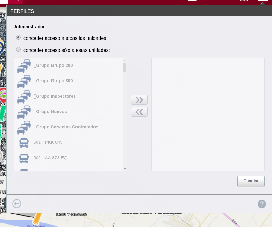Al abrir PERFILES, vemos los perfiles creados y a la derecha de cada uno vemos un Lápiz; un auto; y un símbolo de punto. El LÁPIZ es para ver la ficha de las diferentes que puede ver y modificar ese perfil; Al tocar el símbolo del auto, se despliega el siguiente cuadro, el mismo es para determinar si el perfil que estamos creando puede tener acceso a "todas" las unidades o solo a "determinadas" unidades. Si elegimos que el perfil solo vea algunas unidades, seleccionamos estas unidades y las pasamos ala columna de la derecha, de esta manera el perfil solo vera las unidades permitidas. Guarda y listo!