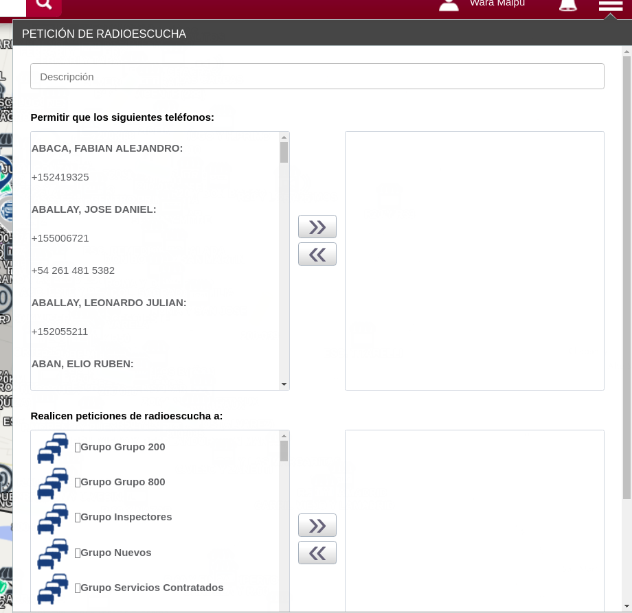 Luego aparece el siguiente cuadro para configurar, que teléfono o usuario puede escuchar cual vehículo, notar que como siempre seleccionamos lo que tenemos en la columna de la izquierda y los pasamos a la columna en blanco de la derecha.