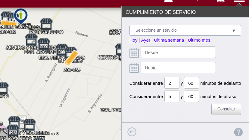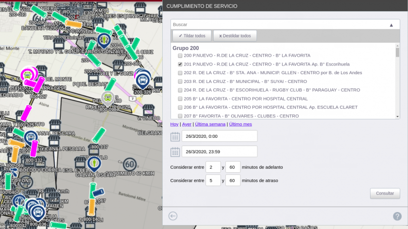 CUMPLIMIENTO DE SERVICIO, este informe nos muestra de que forma se cumplió o no un servicio determinado. exportable a excel. Seleccionamos el servicio a analizar, luego el tiempo y consultamos, notar que los minutos de atraso y adelanto son modificables según la política de la empresa.