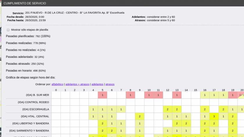 En la parte superior se ve el resumen del cumplimiento y luego se ve la gráfica según los horarios cumplidos del servicio, teniendo en cuenta que el color rojo nos da los adelantados, el verde los vehículos en horario y los amarillos son los que estan atrasados.