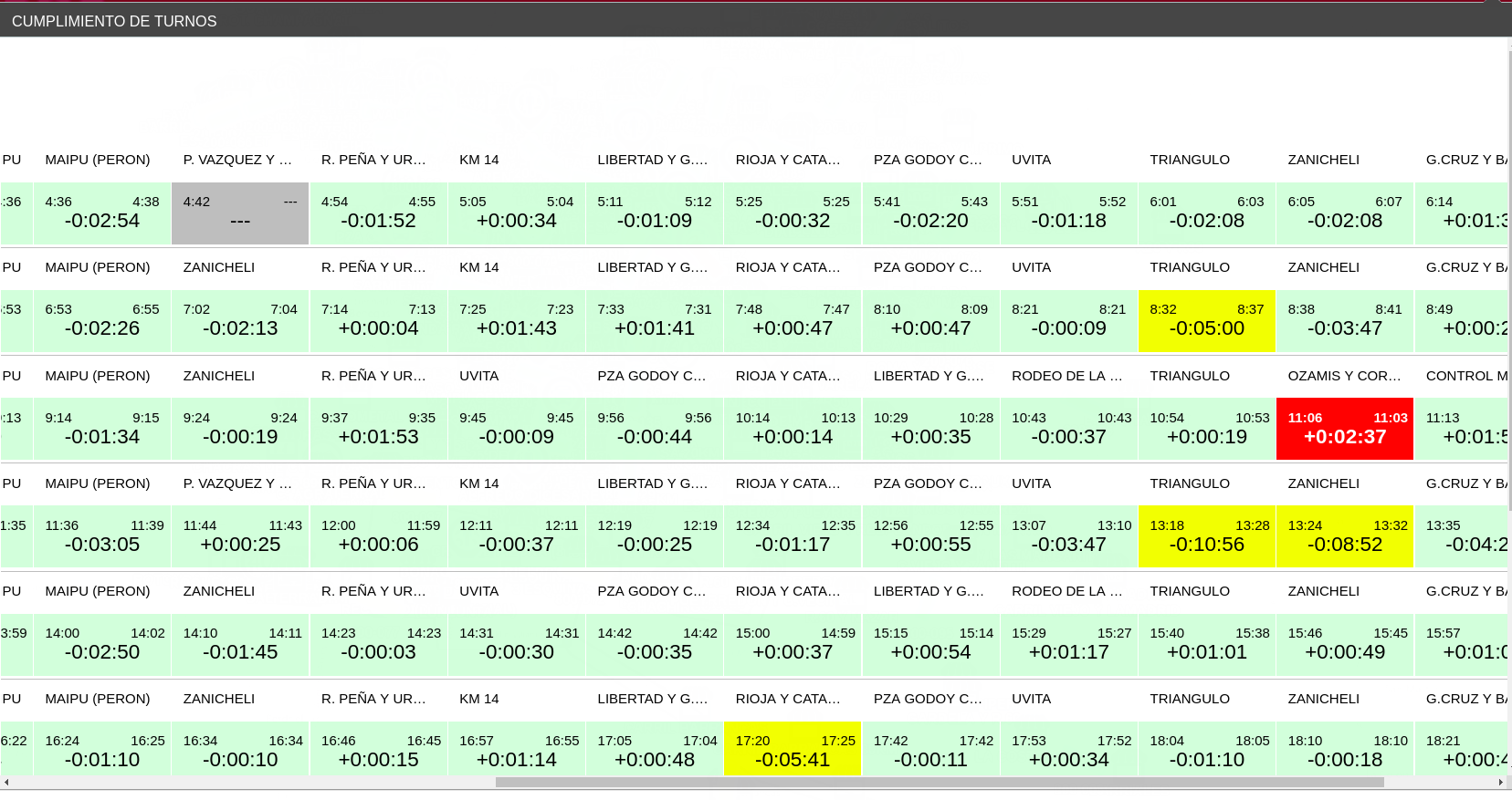 Cuando abrimos el detalle de los turnos encontramos que estan pintados de verde los turos que van por las diferentes etapas a tiempo, en gris la etapa que no se cumplió, en amarillo la que va atrasada y en rojo la adelantada, por ello el simbolo + y los minutos que de adelanto.