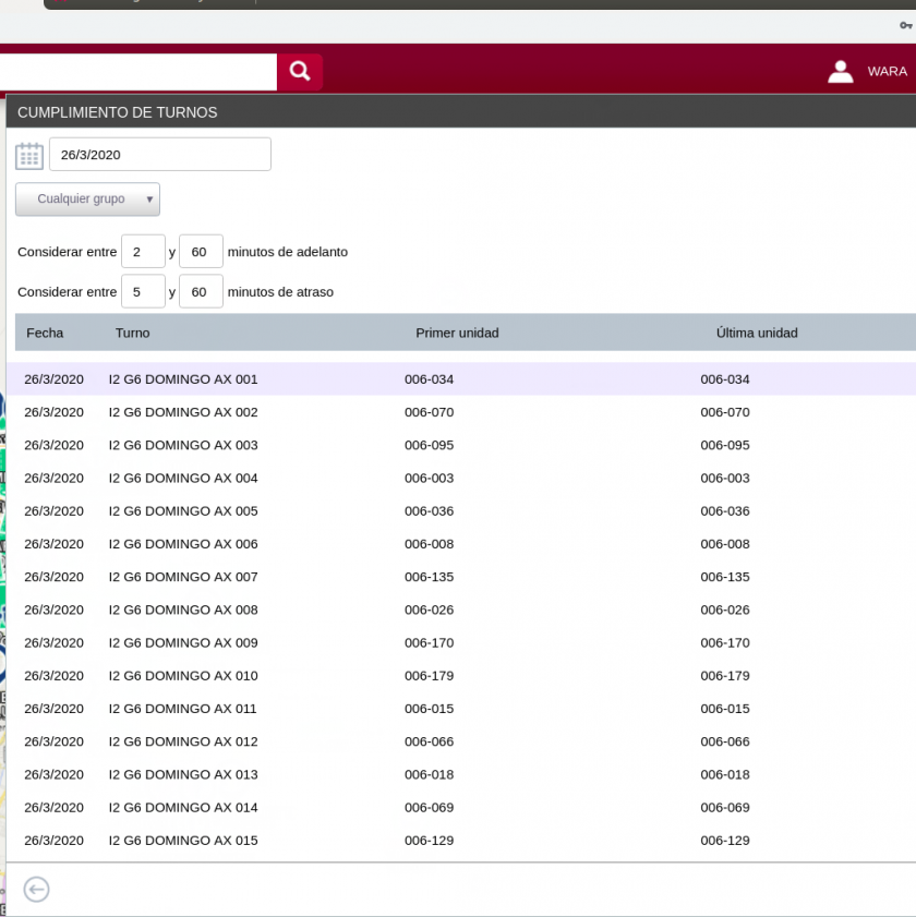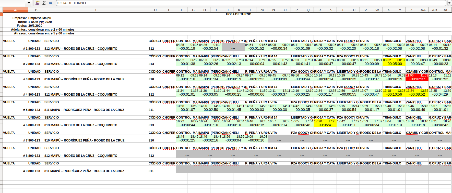 CUMPLIMIENTO DE TURNOS, este informe nos muestra cómo se van cumpliendo los turnos del día, a esto se refiere si a tiempo, adelantados o con retraso. Teniendo en cuenta el tiempo que nosotros determinamos como adelantado y atrasado, así se vera el cumplimiento graficado en colores, Exportable a excel.