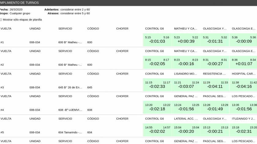 De esta manera vemos el listado de turnos del dia de la fecha, y a la derecha veremos un símbolo de la lupa, para ver el interior de cada turno, esto sera las vueltas de cada recorrido.