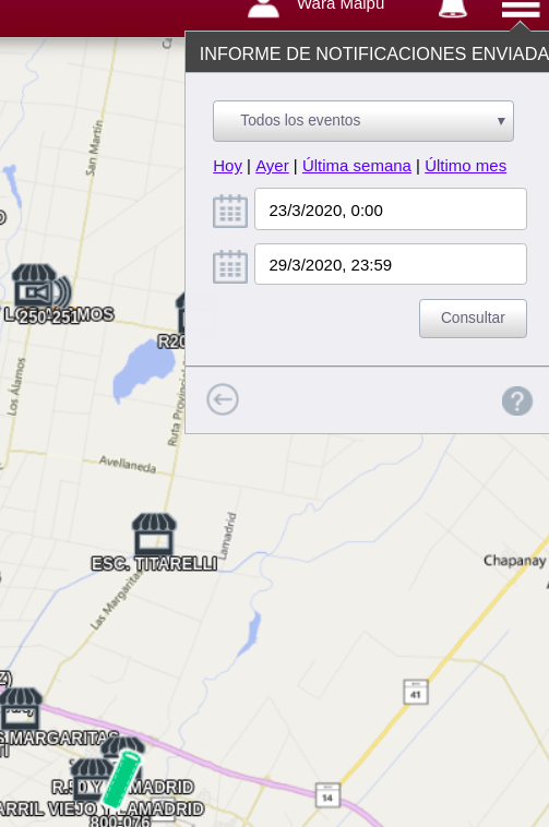 En este informe encontraremos el historial de todos los eventos como apertura de puertas, carga de combustible, tareas de mantenimiento, ingreso y egreso de zona, etc., que fueron configurados o programados por nosotros para que nos fuesen notificados por mail, telegram, sms o pantalla. De esta manera encontrare aqui todas las notificaciones enviadas por dia, semana, mes o de la fecha que seleccione.