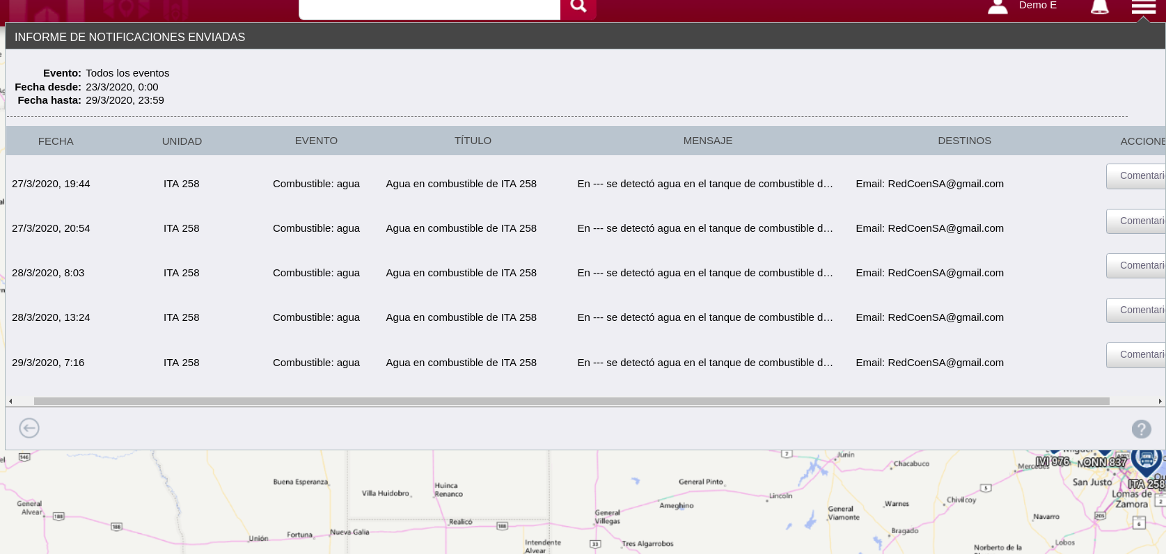 En el informe tenemos la fecha solicitada, de la unidad notificada, el evento notificado, titulo dado a la notificación, mensaje de la notificación, destinos es la forma que pedimos que nos lleguen las notificaciones, acciones, aquí nos da la opción de sumar algún comentario al respecto de la notificación que no se haya hecho en su momento.