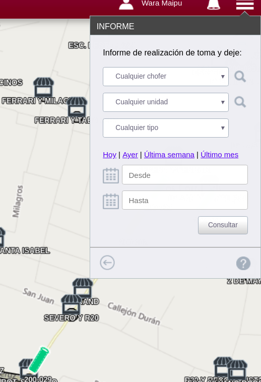 Podemos Seleccionar un chofer, una unidad, y donde figura "CUALQUIER TIPO" se refiere a TOMAR o DEJAR, haciendo referencia a tomar el vehiculo o cuando lo dejamos; luego determinamos el tiempo.
