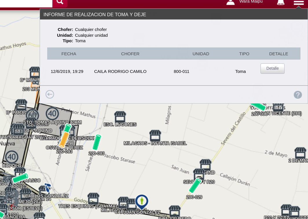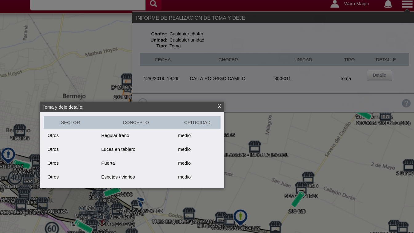 En el Ejemplo vemos que este chofer el dia 12/06/2019 dejo un informe al TOMAR la unidad que vemos en el informe, notar que la pantalla nos da la opción de ver el DETALLE para saber que fue lo considerado: