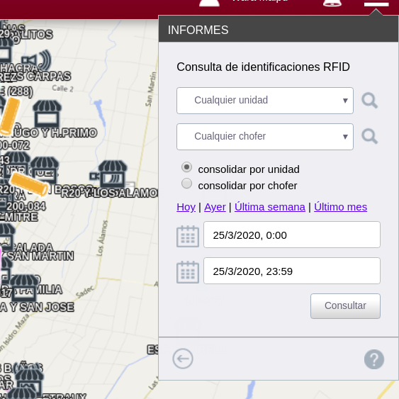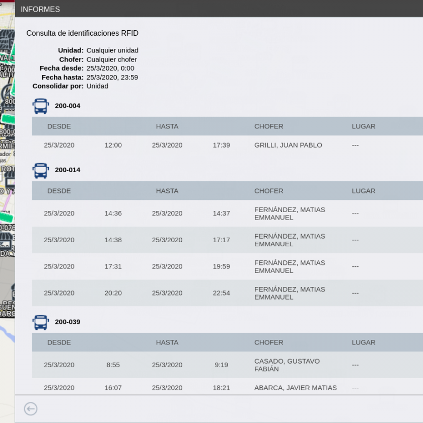 INFORME RFID, este informe lo podremos tener si la unidad tiene identificador de chofer, el cual nos permite saber quién es la persona que está manejando la unidad. Esto muchas veces es condicional para darle marcha al vehículo. Exportable a excel.