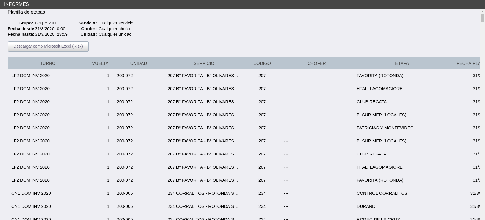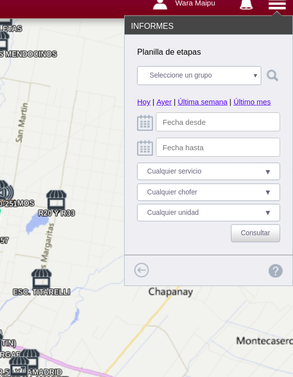 Este informe nos permite ver como es el cumplimiento de las etapas de un servicio en un turno. Seleccionamos el grupo de vehículos, el tiempo que queremos analizar, determinamos luego el Servicio, el chofer y la unidad, notar que la selecion de las 3 ultimas opciones no son limitantes para obtener el informe.