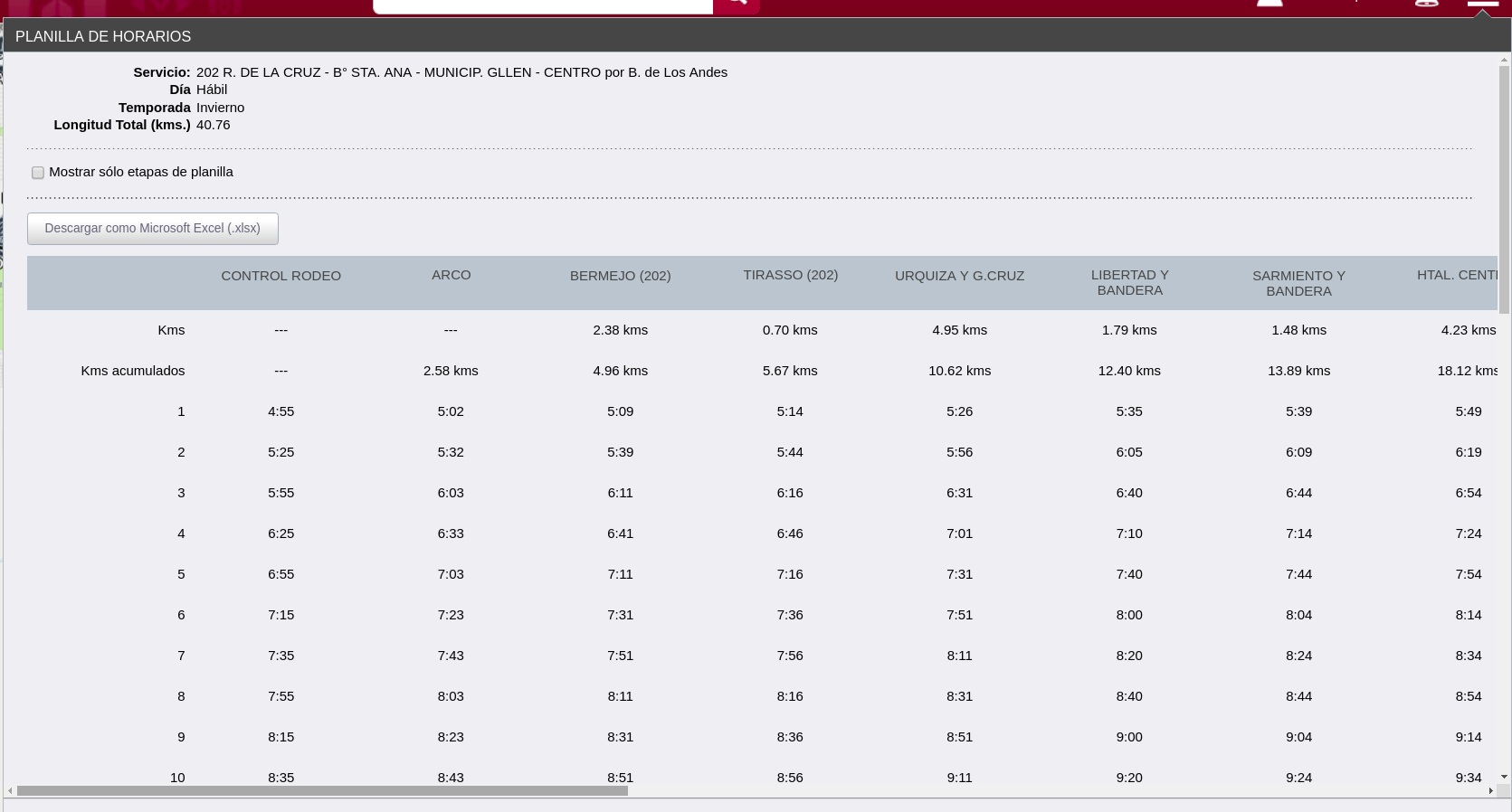 En el informe vemos el Servicio, Día y Temporada seleccionado, y ademas nos indica cuantos KM totales tiene el Servicio Seleccionado. En la parte superior vemos las distintas etapas del servicio y debajo la hora en la que estará pasando por esa etapa, también figuran los km entre etapas y los km acumulados al pasar por las etapas. Luego al final de las columnas con los horarios tenemos Tiempo Total de Vueltas, Velocidad Media de Operacion, y la Frecuencia entre cada vuelta. Exportable en Excel.