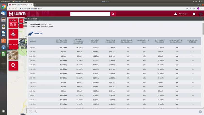 RESUMEN DE FLOTA, este informe nos brinda la misma información que RESUMEN DE VIAJE, pero de toda nuestra flota a la vez y nos lo presenta en un panel. Exportable a excel.