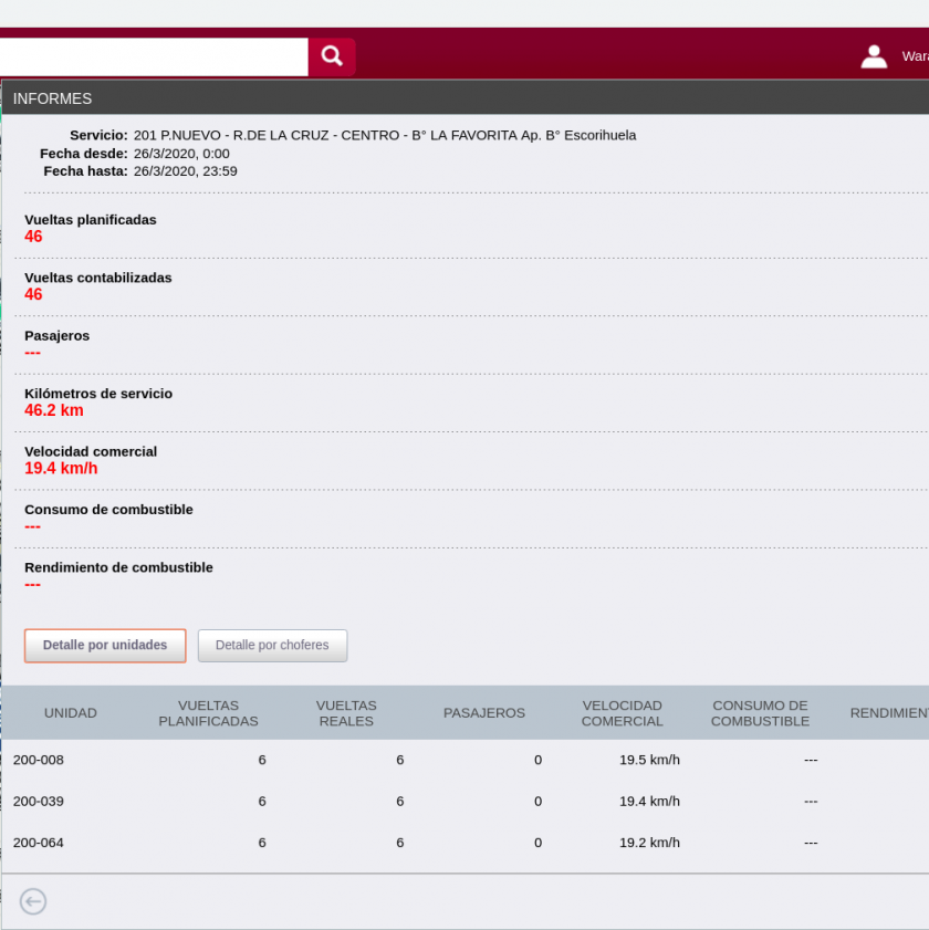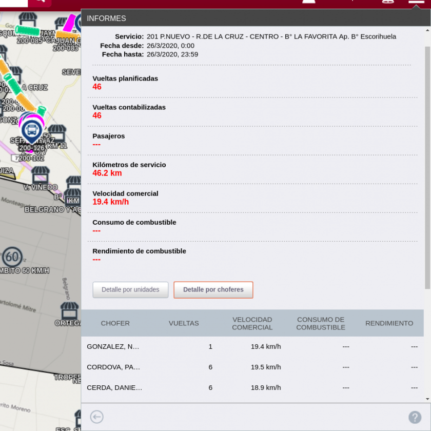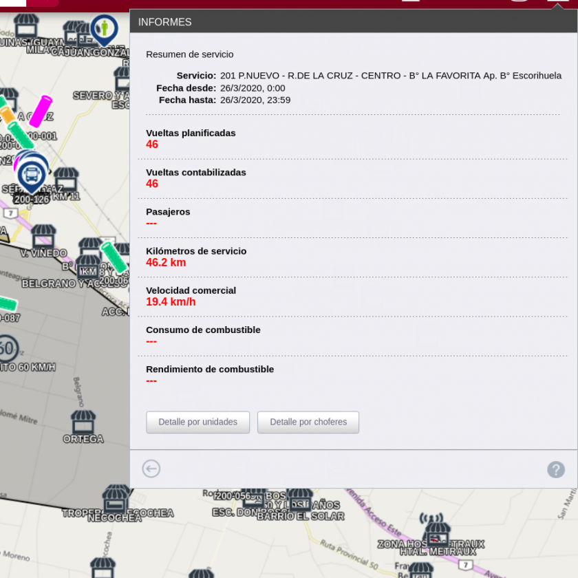 RESUMEN DE SERVICIO, podemos saber de cuantas vueltas está compuesto el servicio, si se cumplieron o no, cuantos km significó, velocidad promedio, gasto de combustible. En primer instancia obtenemos un resumen, que nos da la posibilidad de obtener un detalle del cumplimiento del servicio por unidad o por chofer.